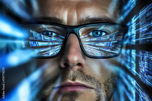 Focused Programmer with Code Reflections. Concept of Technology, Coding, and Innovation.