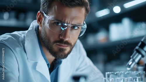 Focused scientist in lab coat and goggles examines test tubes beside a microscope in a modern laboratory.