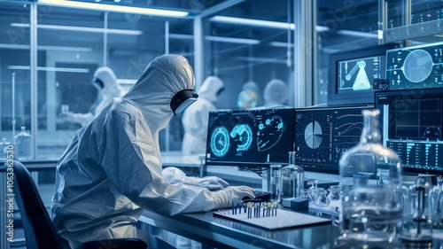 Focused scientist in protective suit analyzing data in a high-tech laboratory