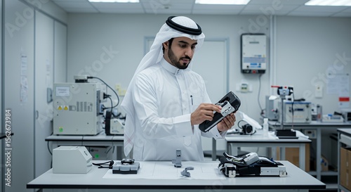 Focused Scientist in Traditional Clothing Carefully Examines Components in a Modern Lab Setting