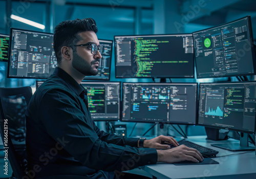 Focused software developer managing intricate systems and data on a multi-monitor workstation in a high-tech environment.