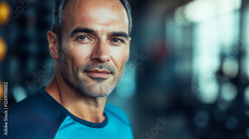 Focused solo runner in athletic wear, upper body shot with natural side lighting, blurred gym background.