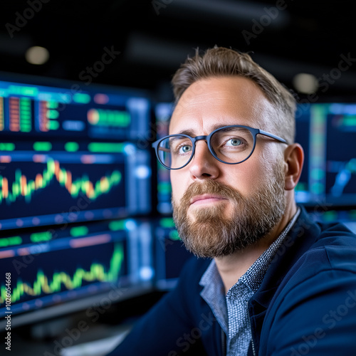 Focused stock trader analyzing market trends on multiple screens in high-tech office environment, showcasing modern finance and technology.