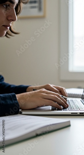 Focused Student Typing on Laptop in Natural Light Study Setting.