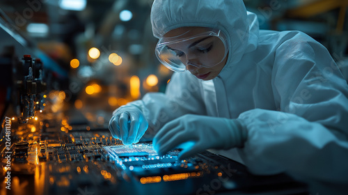 Focused technician in a protective suit examines a circuit board under bright lights in an advanced manufacturing environment, ensuring precision and quality in every detail