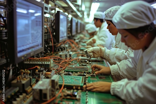 Focused technicians, complex circuitry., a group of people in a kitchen preparing food, Workers in a semiconductor factory producing chips