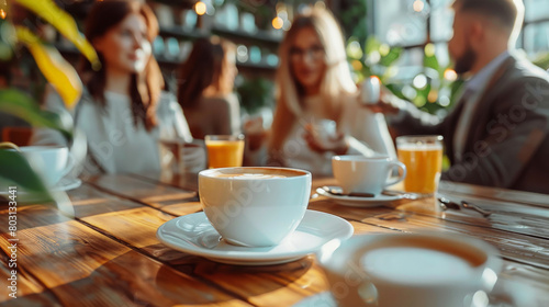 Focused view of a coffee table with friends gathered, showcasing a lively chat over coffee in a warmly lit cafe.
