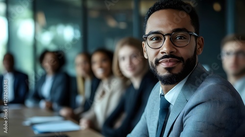 Focused Vision: A confident businessman with glasses smiles at the camera, the leader of a diverse group, poised at a boardroom table. It symbolizes leadership, teamwork.