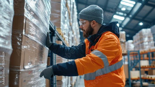 Focused Warehouse Worker Engaged in Organizing Inventory, Exhibiting a Sense of Purpose in a Busy Distribution Environment, Surrounded by Stacked Packages and Shelving Units