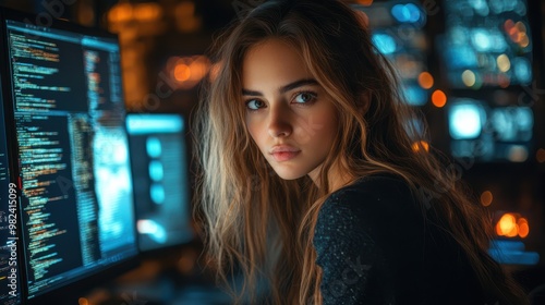 Focused woman coding on multiple monitors in dark room. Programming and developing software in a high-tech environment with glowing screens and technical data.