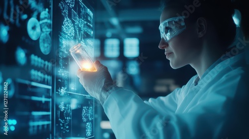 Focused Woman in Lab Coat Analyzing Bright Screen Emitting Glowing Light in Modern Laboratory Environment Conveying Innovation and Scientific Discovery
