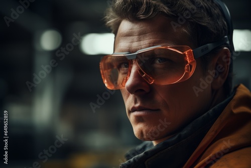 Focused worker man portrait technological industrial complex factory production line workers face safety measures eyewear manufacturing mechanical scientific close-up employee enthusiasm concentration