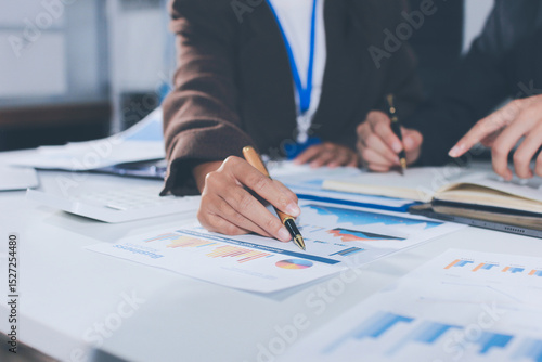 Focused young businessman signing agreement with skilled lawyer in eyeglasses. Concentrated financial advisor showing place for signature on paper contract document to male client at meeting in office