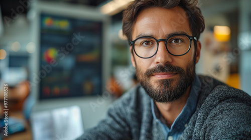 Focused young professional with glasses and beard working in modern office environment