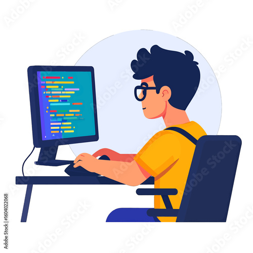Focused young programmer with glasses and dark hair, wearing a yellow shirt, coding on a desktop computer.