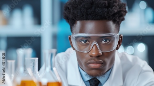 focused young scientist is engaged in his research in a modern laboratory, surrounded by glassware filled with colorful solutions. environment showcases scientific exploration