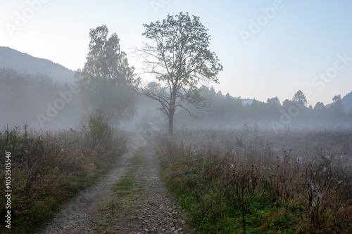 Fog in the mountains in autumn, stretches through the valley between the peaks and the forest.