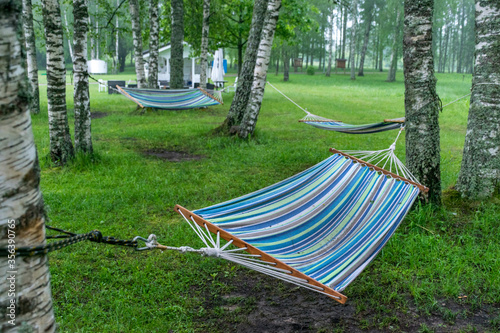 fog landscape in the morning with colorful fabric hammocks in the birch grove