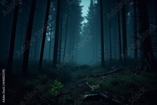 foggy and dark woods at night, mystery forest. Magical saturated foggy forest trees landscape. Generative AI