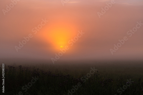 foggy dawn in summer in a field