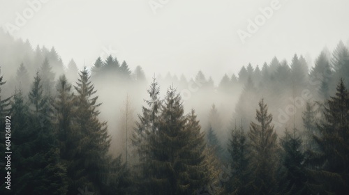 Foggy forest in the mountains. Generative AI.