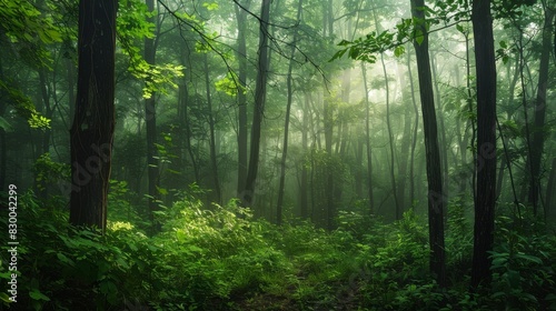 Foggy morning in a dense forest, mysterious and serene, natural beauty, lush greenery, vibrant and alive, peaceful wilderness, dappled sunlight, copy space.