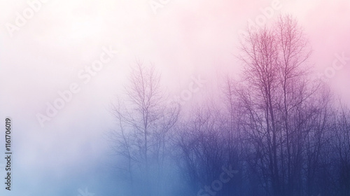 Foggy morning with trees and soft pastel colors at dawn near a serene landscape