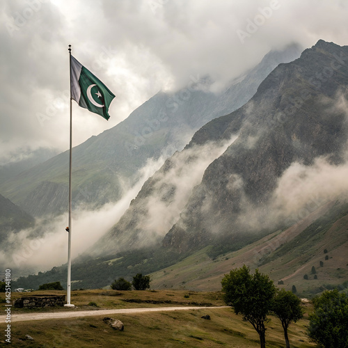 Foggy mountain landscape with flagpole and waving flag