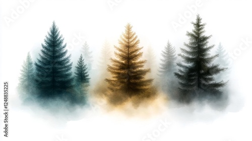 Foggy Pine Forest with a Golden Glow. Generative AI
