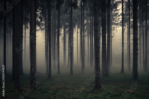 Foggy woods create a mysterious atmosphere in a dense forest during early morning hours
