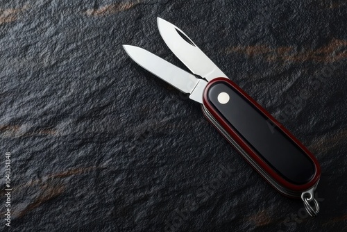 Foldable pocket knife on textured stone surface, functional and stylish design.