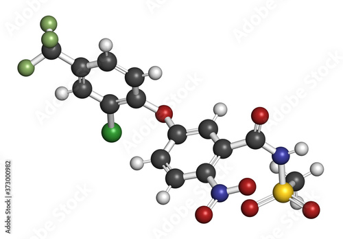 Fomesafen herbicide molecule. 3D rendering. Atoms are represented as spheres with conventional color coding: hydrogen (white), carbon (grey), nitrogen (blue), oxygen (red), chlorine (green), etc