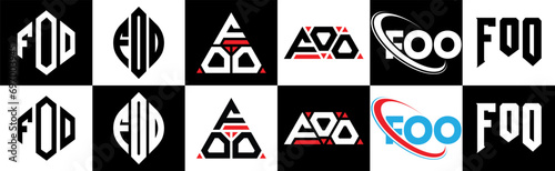 FOO letter logo design in six style. FOO polygon, circle, triangle, hexagon, flat and simple style with black and white color variation letter logo set in one artboard. FOO minimalist and classic logo