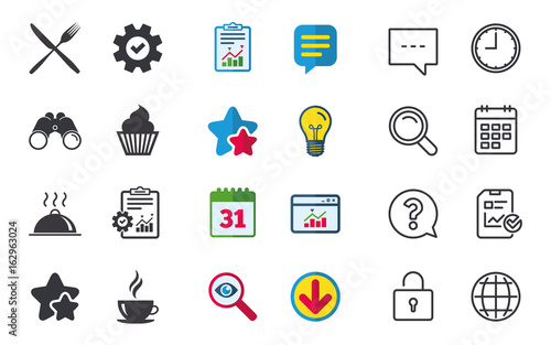 Food and drink icons. Muffin cupcake symbol. Fork and knife sign. Hot coffee cup. Food platter serving. Chat, Report and Calendar signs. Stars, Statistics and Download icons. Question, Clock and Globe