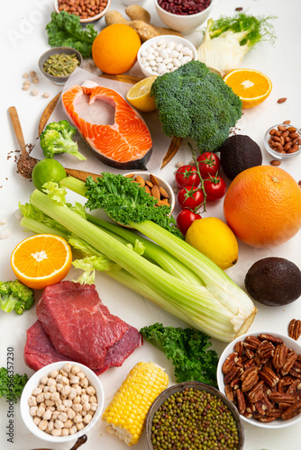 Food background vegetables green uncooked fish meat on light surface