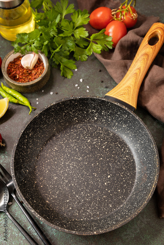 Food cooking background with Frying pan. Empty skillet, vegetables, spices and herbs on dark table background.
