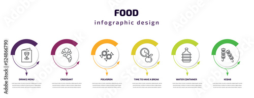 food infographic template with icons and 6 step or option. food icons such as drinks menu, croissant, polvoron, time to have a break, water container, kebab vector. can be used for banner, info