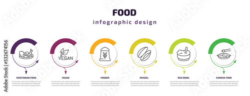food infographic template with icons and 6 step or option. food icons such as vegetarian food, vegan, fodder, mussel, rice bowl, chinese vector. can be used for banner, info graph, web,