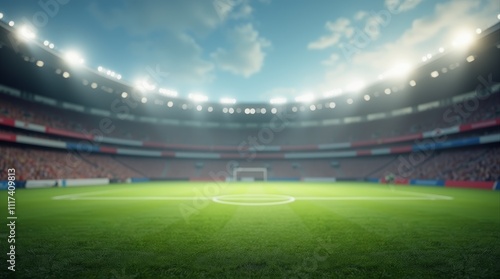 Football stadium with green grass field under bright floodlights and blurred background. Soccer field ready for a match