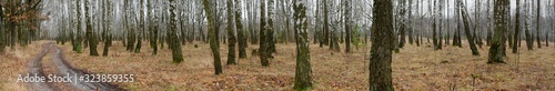 Footpath in the autumn forest. Beautiful autumn birch forest. Leafless trees, leaves have fallen. Late fall. The first snow in the autumn forest. Winter is coming soon.