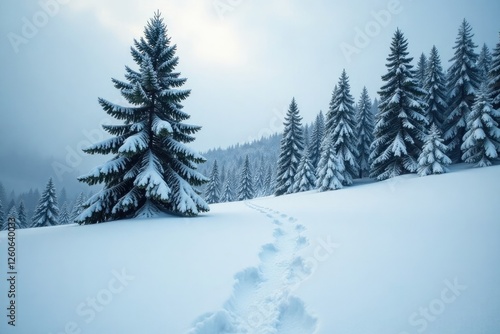 Footprints in deep powder near a towering spruce tree under an overcast sky, coniferous, winter, dense