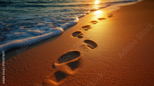 Footprints on a sandy beach at sunset, with gentle waves lapping at the shore.
