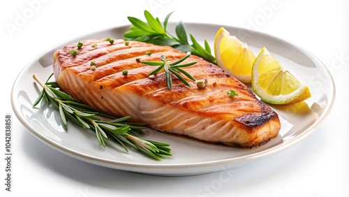 Forced perspective of succulent grilled salmon steak on a plate isolated without background