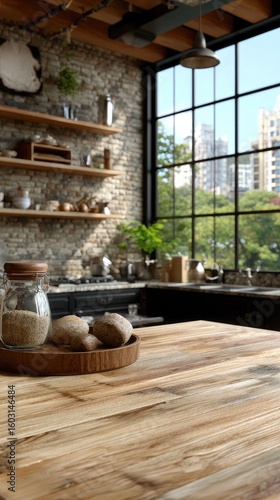 Foreground features a detailed old wooden table, while a modern kitchen and city skyline create a stylish ambiance in the background