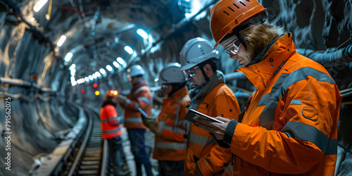 Foreman and construction worker using a digital tablet at the dark underground construction site