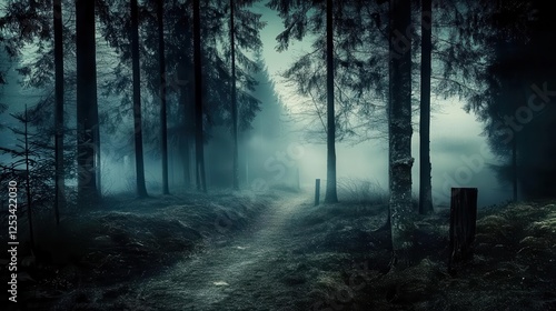 Forest background picture showing A dense forest at night, with tall trees and eerie shadows in the background