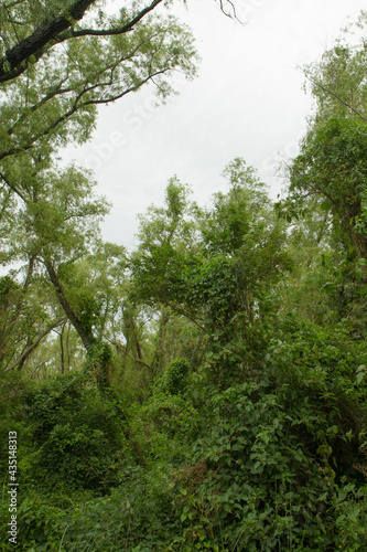 Forest background. View of the green leaves foliage and tree trunks in the jungle.