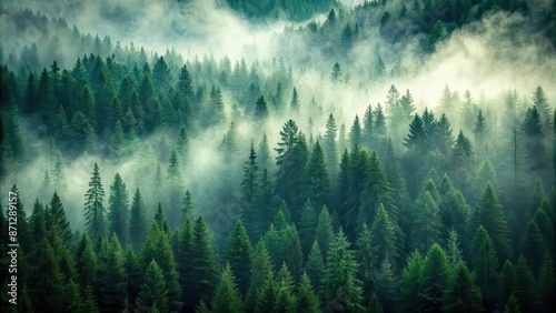 Forest background with fog around trees, dark green panorama, forest, fog, trees, dark, green, landscape, nature, environment