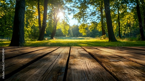 Forest clearing A wooden table in a forest clearing, surrounded by towering trees, with dappled sunlight filtering through leaves and a bright blue sky above