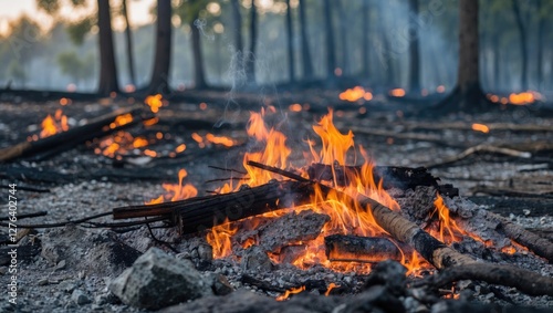 Forest fire aftermath with smoldering ashes, burning logs, and smoke in a wooded area during daytime.